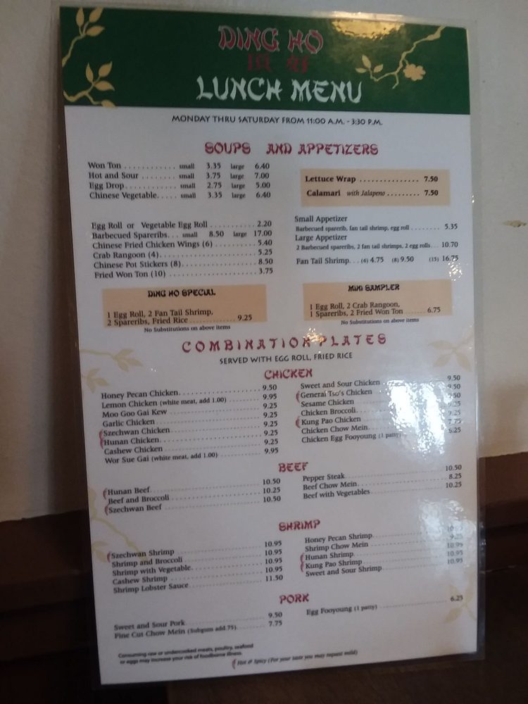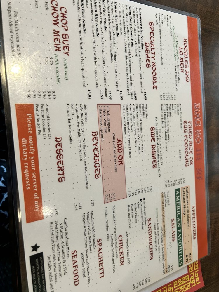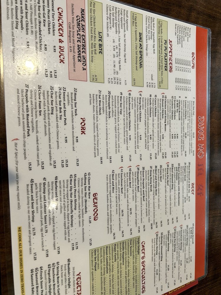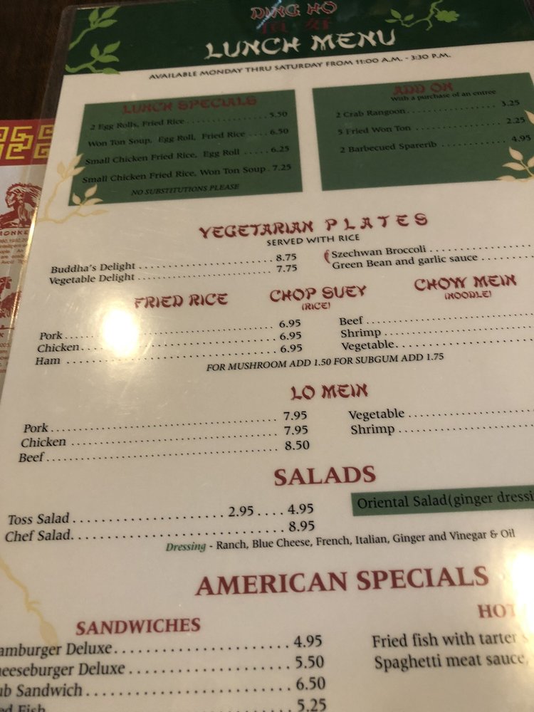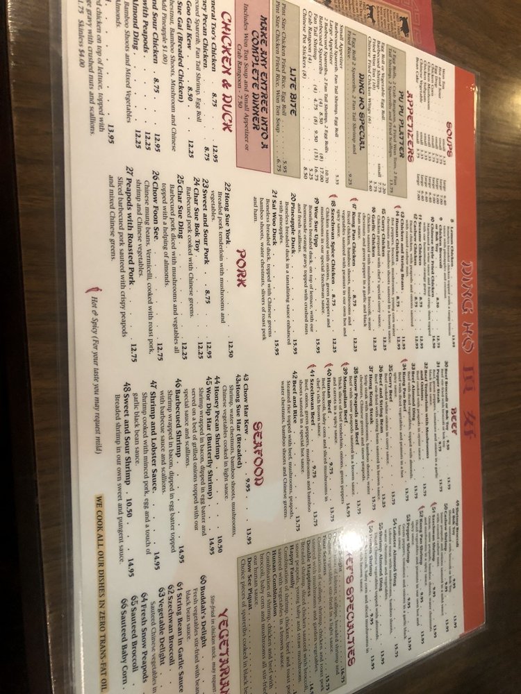 Ding Ho Restaurant in Columbus, OH is a classic Chinese eatery offering a wide range of dishes. With a variety of vegetarian options, cozy outdoor seating, and friendly staff, it's a perfect spot for a casual lunch or dinner. The reviews rave about the delicious food, especially the egg rolls, vegetable soup, and tofu with black bean sauce. The wait staff, like server Dana, are efficient and make dining a pleasant experience. The menu features Cantonese flavors and traditional Chinese dishes, keeping the old-school charm alive. The dining area is clean, comfortable, and welcoming, making it an ideal spot for gatherings with friends and family. Don't miss out on the flavorful won-ton soup and mai-tais while enjoying the reasonable prices and variety of choices at Ding Ho Restaurant.